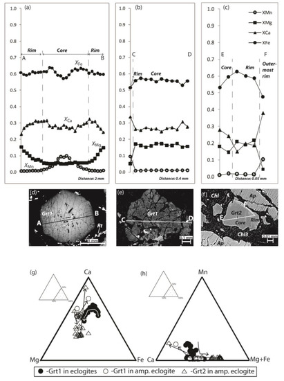zoning patterns of garnets. Zoning patterns (rim-rim) of Grt1 from eclogites (a), amphibolitized eclogite (b), and zoning pattern of Grt2 (c) shown. (d) A,B analysis line on the Grt1 of eclogite. Result of analysis is shown in Figure 6a. (e) C,D analysis line on the garnet of amphibolitized eclogite. Result of analysis is shown in Figure 6b. Garnet (Grt1) from the amphibolitized eclogites is mainly homogeneous in composition except in outermost rim with high Mn content. (f) E,F analysis line on the garnet (Grt2) of amphibolitized eclogites. Result of analysis is shown in Figure 6c; (g) Ca−Mg−Fe chemical diagram for garnets of eclogites and amphibolitized eclogites. White arrow indicates from core to rim of garnet in the eclogite. Black arrow indicates from core to rim of Grt2 in the amphibolitized eclogites. (h) Mn−Ca−Mg + Fe chemical diagram for garnets of eclogites and amphibolitized eclogites. Arrows indicate from core to rim of garnet in the eclogites and amphibolitized eclogites.
