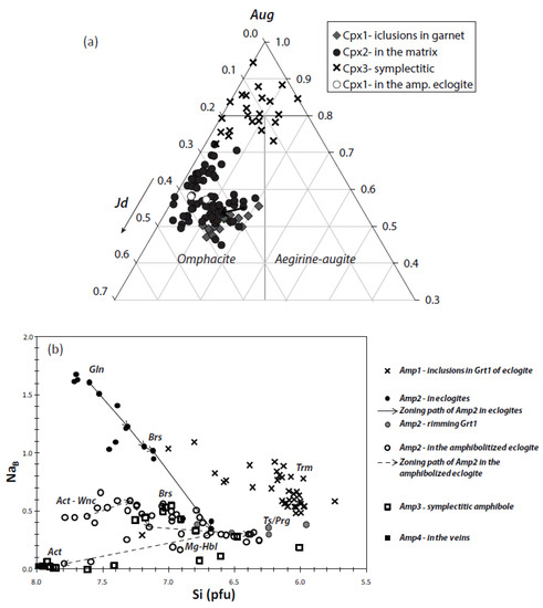 (a) Chemical composition of clinopyroxene from eclogites and amphibolitized eclogite; (b) Chemical composition of amphiboles from eclogites and amphibolitized eclogite.