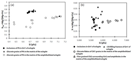 (a) Chemical composition of phengite from eclogites and amphibolitized eclogite. (b) Chemical composition of chlorite from eclogites and amphibolitized eclogite.