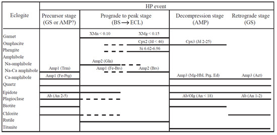 paragenesis of eclogites. ECL, eclogite facies; BS, blueschist facies; AMP, amphibolite facies; GS, greenschist facies.