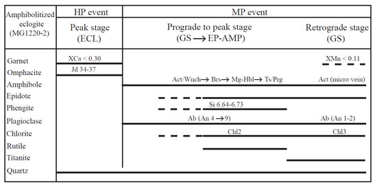 The prograde stage of the MP event is characterized by the partially resorbed core zoned with Act/Wnc→Brs of the Amp2 in the amphibolitized eclogite. The P-T path of prograde stage of the MP event of the amphibolitized eclogite passed through actinolite and barroisite stability fields (Figure 11) [48].