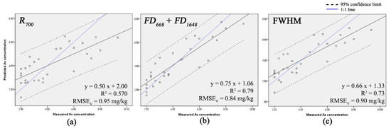 Comparison between the measured As content in experiments and the predicted As content derived from regression models: (a) validation model at R700, (b) validation model at FD668 and FD1648, and (c) validation model at FWHM.