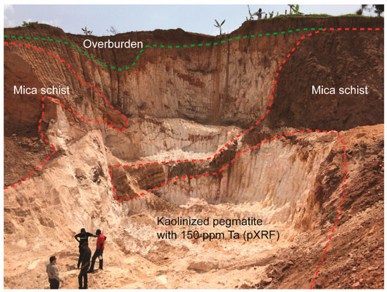 Figure 1. Typical exposure of Li–Cs–Ta (LCT) pegmatite in the Ruhanga area, Rwanda. This pegmatite is currently (in 2018) exploited for columbite-tantalite mineralisation. The pegmatite body is 15–20 m wide and has a lateral extension of at least 2.5 km. Complete kaolinisation of feldspars, resulting in an unzoned appearance, characterise most Rwandan pegmatites. This creates issues with slope stability [45], but allows simple artisanal open-cast excavation of the orebody to a depth of 30 m. Note the rafts of biotite schist in the weathered pegmatite illustrating the assimilation of country rock material, which can have a detrimental influence on ore grade and dilution, and therefore needs to be appropriately modelled.