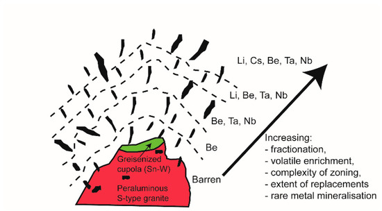 Figure 2. Traditional model of regional zonation and rare metal enrichment of pegmatites and pegmatite fields related to S-type granite plutons implying that zoned pegmatite fields are related to and have a similar age as a nearby granite intrusion (modified from [26]). This model is currently challenged by a number of authors who outline evidence for an anatectic origin of pegmatite melts, e.g., [4,13,36,37,47]. Whilst pegmatite fields can be zoned, the zonation is in some cases not spatially related to a pluton, but to individual pods of pegmatitic melt.