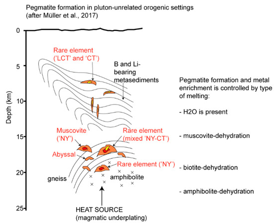 Figure 3. Simplified model of anatectic pegmatites formed in orogenic settings characterised by a distinct lack of nearby granite plutons (modified from [13]).