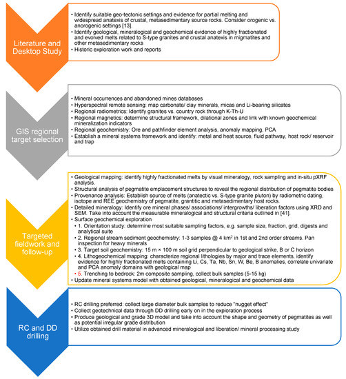 Grassroots exploration programs commonly commence with a detailed literature review of regional geology, mineralisation occurrences, and styles (Figure 4). Exploration geologists unfamiliar with LCT and Sn(–W) mineralisation are advised to become familiar with general pegmatite geology and mineralogy, in order to develop an understanding of element associations, fractionation patterns, orebody geometry and grade–tonnage relationships [2,3,10,34]. Furthermore, a desktop study should aim to identify evidence of suitable regional geo-tectonic settings involving deep crustal reworking and exhumation processes, leading to partial melting of crustal, metasedimentary source rocks, such as along the European Variscan belt [12]. In particular, consideration should be put on different orogenic and anorogenic settings and the presence of anatectic melts [13]. Supporting evidence in the form of exhumed granulites, migmatites and two-mica peraluminous granites with accessory minerals, for example tourmaline and fluorite indicating the presence of B and F fluxing elements, can be obtained from regional geological maps and databases. For example, Dill (2015) [10] provides an exhaustive list of pegmatite sites and mineralogy, which is useful and applicable to generating conceptual exploration targets. National geological survey departments provide summary reports of historic company exploration work and represent a valuable resource. For example, the Finnish Geological Survey carried out investigative work into the occurrence of LCT pegmatites in the Kaustinen Province and other permissive tracts, and published geological, geophysical and mineralogical data in support of a growing local mining industry [56,58]. Similarly, the Ontario Geological Survey regularly produces multi-commodity exploration reports covering summaries of recommended areas prospective for LCT mineralisation [59].