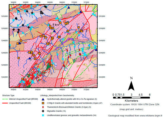 Figure 6. Lithologies interpreted from stream sediment geochemistry on modified Bureau de Recherches Géologiques et Minières (BRGM) geological map and structures, modified from Steiner (2019) [29] and BRGM (2019) [79]. The illustrated area covers the SW–NE trending Central Vosges Mg–K (CVMg–K granite), surrounded by highly metamorphic rocks of Paleozoic age. Observed leucogranitic and pegmatitic rocks with visible muscovite and tourmaline (location indicated as 5 b–c) along with interpreted “hydrothermally-altered granites with W–Li–Cs–Ta signature” are principally located along SW–NE orientated fault systems in the CVMg–K granite.