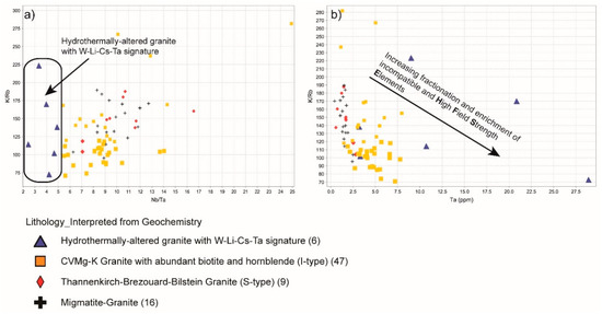 Figure 8. Examples from a stream sediment study [29] illustrating the use of (a) K/Rb vs. Nb/Ta and (b) K/Rb vs. Ta bivariate plots to determine highly fractionated granitic lithologies enriched in incompatible elements. In the central Vosges Mountains (France), peraluminous melts affected by hydrothermal alteration are thought to occur within a larger I-type granite province. In stream sediment samples, hydrothermally-altered granites are characterised by 70 < K/Rb < 225 and Nb/Ta < 5.