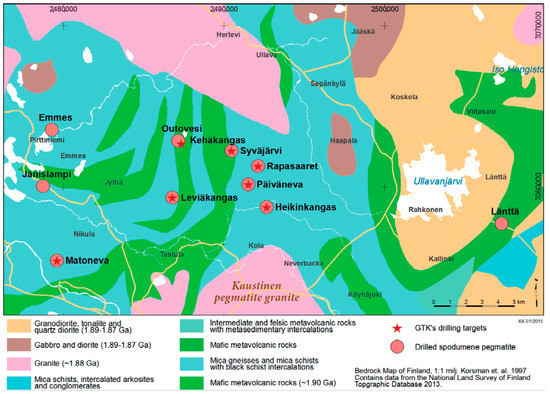 56. Ahtola, T.; Kuusela, J.; Käpyaho, A.; Kontoniemi, O. Overview of lithium pegmatite exploration in the Kaustinen area in 2003–2012. In Report of Investigation 220; Geological Survey of Finland: Espoo, Finland, 2015; 28p. [Google Scholar]