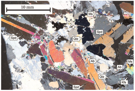 Figure 10. Thin section of spodumene pegmatite from drill core in the Leviäkangas exploration area, Kaustinen Li pegmatite province. Mineral abbreviations: Spd (Spodumene), Qtz (Quartz), Kfs (Potassium feldspar, Ab (Albite), Ms (Muscovite). From Ahtola et al. (2015) [56].