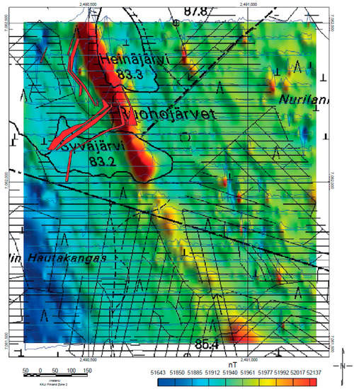 Figure 12. Ground magnetic map of the Syväjärvi exploration area, Kaustinen Li pegmatite Province. Modified from Ahtola et al. (2015) [56]. The blue lines show the magnetic profiles, whereas the red polygons mark the spodumene pegmatite. The positive magnetic anomaly (red colour) is caused by intermediate volcanic rocks. Basemap © National Land Survey of Finland, license number MML/VIR/TIPA/217/10.