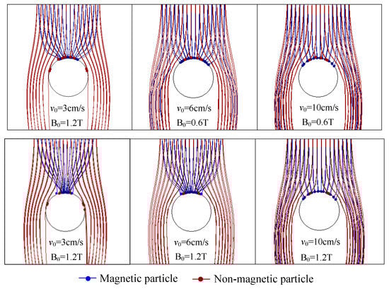 Figure 2, the trajectories of magnetic particles at the initial time are similar to those of non-magnetic particles, as they are mainly dragged by the hydrodynamic drag during this period. However, when the particles move around the wire, the trajectories of magnetic particles are significantly different from those of non-magnetic particles. The magnetic particles would be attracted by the magnetic wire due to the action of magnetic force, resulting in their variation in their trajectories. But, when the non-magnetic particles move around the wire, they flow through the wire under the action of hydrodynamic drag, with two non-magnetic particles colliding with the wire due to their inertia effect under the particular condition of 1.2 T magnetic induction and 3.0 mm/s flow velocity; but, they were instantaneously bounced back by the magnetic wire.