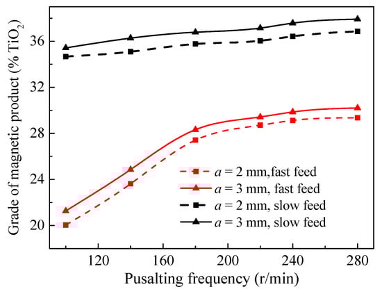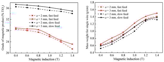 2. The experimental results are consistent with the theoretical analyses. The wires in slow feed mode produced a higher capture selectivity than that in fast feed mode, and their difference in the selective capture increased with increase in the magnetic induction and decrease in the pulsating frequency. The multi-wires produced much lower TiO2 grades of magnetic products than those from the single wire, as they produce different effects on the flowability of slurry.
