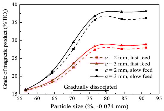 For large particle size, the material was not fully dissociated, and then many intergrowth minerals combining magnetic and non-magnetic components may be captured on the wire surface, reducing the TiO2 grade of captured deposits. With decrease in the particle size, the intergrowths would be gradually liberated, which reduces the number of intergrowth minerals in the magnetic products and improves their TiO2 grades. However, in the fast feed mode, many non-magnetic particles would be easily entrained into the magnetic deposits, as clearly described above, so that with decreasing particle size, the increase in the TiO2 grades of magnetic products in the slow feed is not so significant as that in the fast feed.
