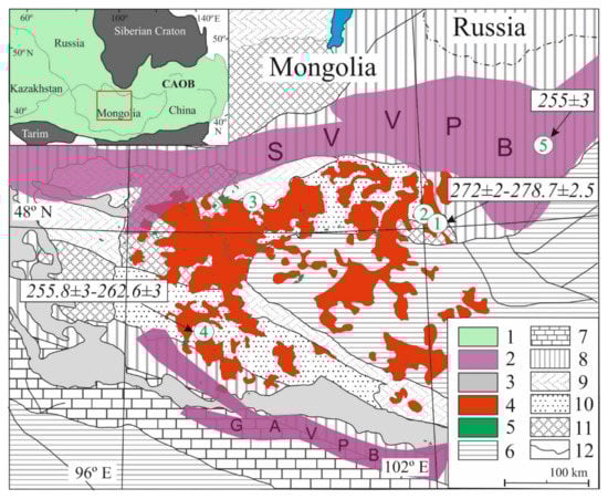 - Shelepaev, R.A.; Egorova, V.V.; Izokh, A.E.; Vishnevsky, A.V.; Shelepov, Y.Y.; Rudnev, S.N. Permian gabbroid intrusions of the Khangai highlands (Western Mongolia). Isotope dating of geological processes: New results, approaches and prospects. In Proceedings of the VI Russian Conference on Isotope Geochronology; Sprinter: St. Petersburg, Russia, 2015; pp. 337–338. (In Russian) [Google Scholar]