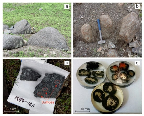 Photos of outcrops. (a) Layered gabbro of the Oortsog massif; (b) lumps of gabbro with oxidized sulfide droplets; (c) sample of Bt-Hbl-bearing mezogabbro with disseminated sulfides; (d) the preparation with sulfides droplets mounted in epoxy resin and polished.