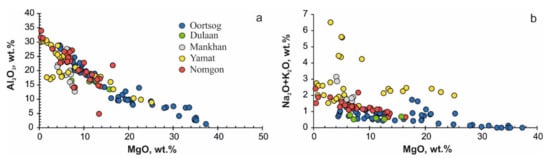 MgO vs. Al2O3. (a) (Na2O + K2O); (b) of mafic-ultramafic rocks of the Khangai upland.