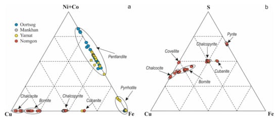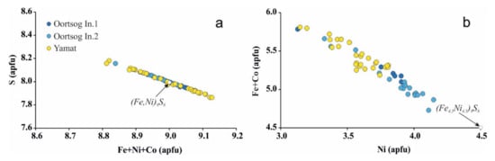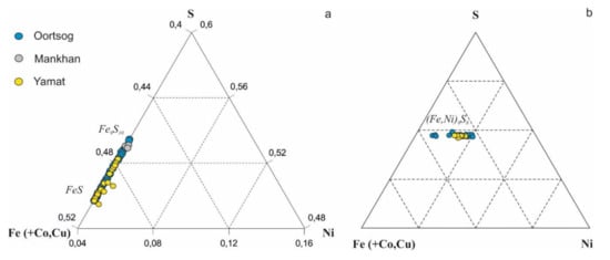 Pirrhotite. The sulfide assemblage of the biotite (Bt)-bearing mezogabbro of Intrusion 2 in the Oortsog massif consists of hexagonal pyrrhotite with troilite lamellae (Figure 5c). The pyrrhotite compositions are shown in the Fe(+Co,Cu)–S–Ni diagram (Figure 6a). Troilite (FeS) and hexagonal pyrrhotite (Fe1-xS) are found in both massifs and their compositions occur as continuous solid solution FeS-Fe1-xS). Troilite contains Ni (up to 0.49 wt%), as the hexagonal pyrrhotite (up to 0.14 wt%). The content of Co in the pyrrhotite reaches up to 0.33 and 0.16 wt% in the rocks of Oortsog and Ymat massifs, respectively. The change of compositions from troilite to hexagonal pyrrhotite is due to the evolution of rock composition from plagioperidotite to leucogabbro [50]. Thus, the proportion of sulfur in pyrrhotite increases with an increase of the leucocratic rock ratio in the series that indicates an increase of sulfur activity during the development of magmatic and ore-forming systems in the Oortsog massif.