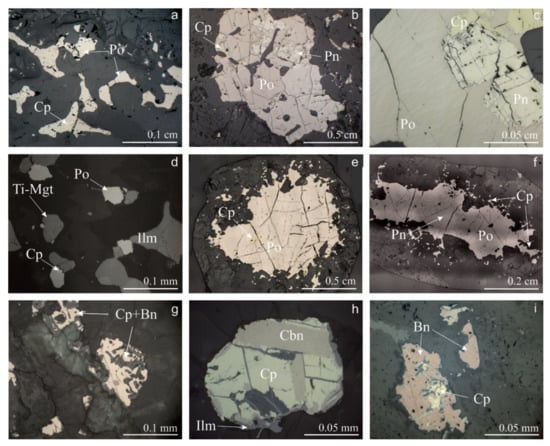 Microphotographs in reflected light of sulfides mineralization in the mafic-ultramafic massifs of the Khangai upland. (a–c) Ortsog massif: (a) interstitial sulfides; (b) sulfide droplet of chalcopyrite-pentlandite-pyrrhotite composition; (c) fine lamelaes of troilite in hexagonal pyrrhotite; (d) disseminated sulfides in rocks of the Mankhan massif; (e,f) large droplets of sulfides in the Yamat massif; (g–i) disseminated sulfides in the Nomgon massif of cubanite-bornite-chalcopyrite composites. Po—pyrrhotite, Pn—pentlandite, Cp—chalcopyrite, Bn—bornite, Cbn—cubanite, Ti-Mgt—titanomagnetite, Ilm—ilmenite.