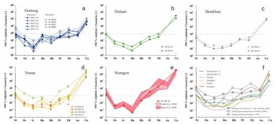 The characteristics of PGE are given in Table 5. The average total of PGE (ΣPGE) content in rocks from the massifs of the Khangai upland (Oortsog, Dulaan, Mankhan, Yamat, and Nomgon) are 15, 3.5, 3.3, 6, and 444 ppb, respectively, and the average ΣPGE in the disseminated sulfide ores in the Nomgon intrusion is higher than in others. These are varied and are lower than those of the world’s giant mafic-ultramafic complexes, such as the Neoproterozoic Jinchuan deposit (0.26–135 ppm [16]), Kalatonge (to 489 ppb [61]), Kingash (to 2.9 ppm [62]), and Permo-Triassic Talnakh deposit (39–279 ppm [63]).