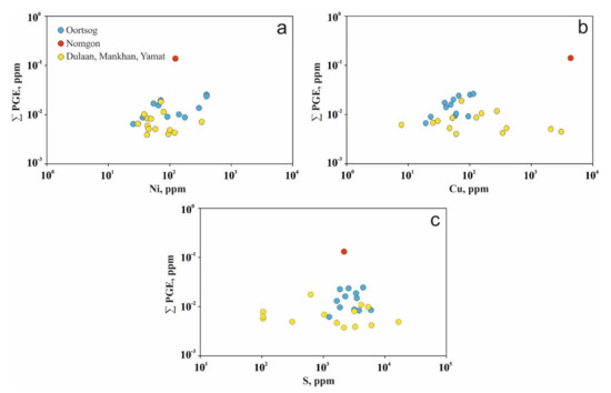 The ΣPGE in rock samples shows the moderate positive correlations of Ni and Cu with S content. Figure 9a–c indicate that most of the PGEs are present in the sulfides. The results of the recalculation to 100% sulfide show that the average ΣPGE of the massifs Oortsog, Dulaan, Mankhan, Yamat, and Nomgon are 2.31, 0.93, 0.92, 23.34, and 30.53 ppm, respectively. It is also lower than in the Jinchuan, Kalatonge, Kingash, and Talnakh deposits, but these are similar to the Cu–Ni sulfide deposits of Jinchuan and Kambalda, whereas the sulfide-bearing rocks of the Nomgon massif enriched in PPGE (Figure 8e) are similar to those of the Talnakh deposit (Figure 8f).