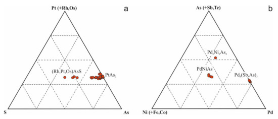 Composition of PGE minerals in the Nomgon massif: (a) solid solution of sperrylite PtAs2-hollingworthite (Rh,Pt,Os)AsS; (b) PGE mineral paragenesises for the Ni-As-Pd system.