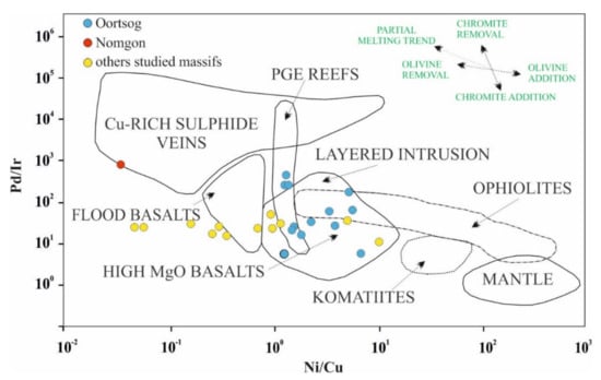 Ir, Ru, Os, and Ni are more compatible than Rh, Pt, Pd, and Cu during partial melting of the mantle [57,98]. Thus, magma formed by a high degree of partial melting of the mantle would result in relatively high Ni/Cu and low Pd/Ir ratios. Most sulfide-mineralized samples from the Khangai upland have moderate Ni/Cu ratios (1.30–5.97 for Oortsog, 0.03–0.92 for other massifs) and Pd/Ir ratios of 15 to 822. Most of the samples from the Khangai upland are plotted (Figure 12) within the field of high-Mg basalts, with the exception of those where Cu content is high (Nomgon and several samples of the Yamat massif (Table 5), indicating that the primary magmas of the intrusion were likely high-Mg basaltic in composition.