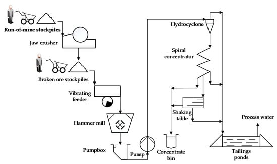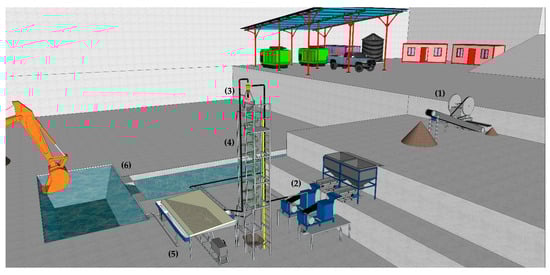 Nowadays, the artisanal and small-scale mining (ASM) of raw materials in resource-rich developing and emerging countries is considered as future raw materials supply for developed economic sectors []. Using small-scale processing implies low investment costs with a flexible working environment. The realization of small-scale projects take relatively short time. Depending on the mining progress, the semi-mobile plant is designed to respond to varying throughputs and ore grades. In comparison to conventional mining, processing from ASM is less automated resulting in a higher demand of personnel, which provides opportunities for more jobs in the operating region [,].