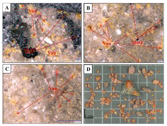 Optical microscope images of cemented materials (A–C): Van—Vanadinite, MnO—Manganese oxide; (D) Hand-specimen photograph of coarse vanadinite particles (“red” vanadinite).