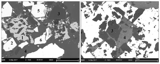 Electron probe microanalysis with BSE of lead vanadate minerals was conducted to obtain their elemental composition. The elemental composition of specific spots, which have previously been optically defined by microscopy (Figure 3), is summarized in Table 3, with corresponding BSE images in Figure 5.