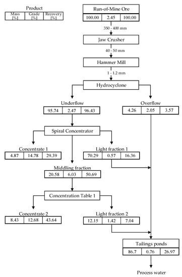 Characterization of an obtained pre-concentrate of the spiral concentrator, enriched with manganese minerals, is presented in Section 3.4. In order to respond to varying composition of feed material, the plant is designed to react flexibly on changing ore properties by adjusting the settings of the concentration aggregates.