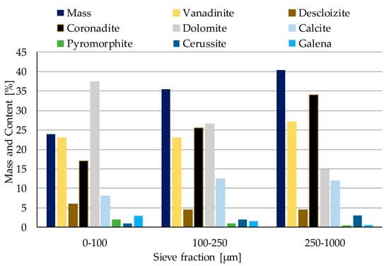 A first concentrate sample was obtained from the spiral concentrator of the small-scale processing plant and has been analyzed via MLA and XRD, resulting in the modal mineralogy in the different sieve fractions in Figure 8.