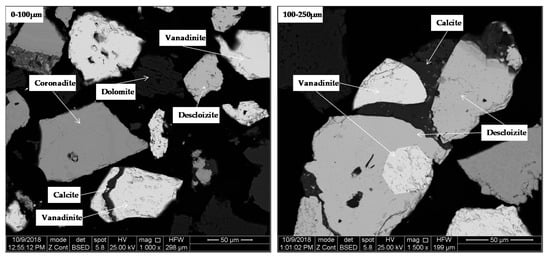 The MLA of the concentrate reveals that about 90% of the vanadinite is liberated more than 95% in all three particle size fractions and even 97% are liberated more than 50%, with dolomite and calcite as the main associated minerals. In contrast to that, liberation of descloizite varies in all fractions. While in the fine fraction <100 µm 57.5% of the descloizite is liberated more than 95%, it is only liberated to 27% in the fraction 100–250 µm and to 13% in the fraction >250 µm, respectively. This results in 28% of total descloizite that is liberated more than 95% and 58% with a liberation degree of 50%. Main mineral associations are calcite and dolomite (27% and 26%), but also coronadite is associated with 14% of the present descloizite. BSE images of the fractions <100 µm and 100–250 µm are shown in Figure 9.