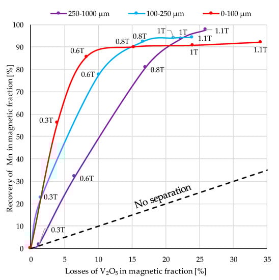 Figure 10 shows a separation of 80–90% of manganese by the magnetic field intensity in the range of 0.6–0.8 T into the magnetic fraction with corresponding losses of vanadium at 14–18%.