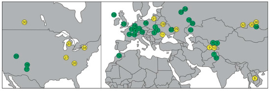 The location of Phanerozoic marine evaporite formations analysed (green colour indicates formations deposited from seawater of SO4-rich chemical type, and yellow colour indicates formations deposited from seawater of Ca-rich chemical type). Neogene: 1, 2, 3—Carpathian Foredeep, Ukraine, Poland; Transcarpathian Depression, Ukraine; Paleogene: 4, 5—Fergana Basin, Uzbekistan; 6—Alsace, France; 7—Bahadur Khel Formation, Pakistan; Cretaceous: 8—Maha Sarakham Formation, Thailand; 9—SW branches of Hissar Range, Tajikistan; Jurassic: 10—SW branches of Hissar Range, Tajikistan; 11—Foredobrudzha, Ukraine; Triassic: 12—Atlas-Oran Basin, Western Moroccan Basin, North Africa; 13, 14—Keuper, Muschelkalk, Germany, Great Brittain, France; 15—Buntsandstein, German Basin; Permian: 16, 17—Delaware Basin, USA; 18—Southern Permian Basin, Zechstein, Poland, Germany; 19, 20,—Uralian Foredeep, Russia; 21—Uralian Foredeep, Russia, Caspian Depression, Kazakhstan; 22—Donbas, Ukraine; Carboniferous: 23, 24—Eastern European Platform, Russia; 25—Paradox Basin, USA; 26—Saltville Basin, USA; 27—St. Louis Formation, USA; Devonian: 28—Prypiat Depression, Belarus; 29—Dnipro-Donets Depression, Ukraine; 30—Saskatchewan Basin Canada; 31—Baltic Syneclise; 32—Central Tuva deep, Russia; Silurian: 33—Michigan Basin, USA; 34—Appalachian Basin, USA; Cambrian: 35, 36—Irkutsk Amphitheatre, Russia; Upper Neoproterozoic: 37—Salt Range, Pakistan; 38—Irkutsk Amphitheatre, Russia.