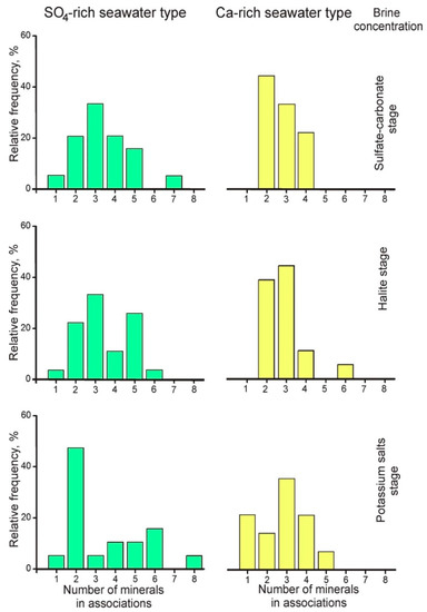 All considered publications provide descriptions of one to eight clay minerals in a water-insoluble residue of evaporite deposits. The associations contain mostly two or three minerals; for the SO4-rich seawater chemical type, such associations make up 52.7–55.5%, for the Ca–rich type—50–83.3%. For the SO4-rich seawater chemical type, associations of 5–8 minerals occur at all stages of brine concentration, and for the Ca-rich type, there are usually not more than four minerals in association (once 5 and once 6 minerals). There are two histograms of the quantitative distribution of minerals in associations that contain two maxima each (Figure 2).