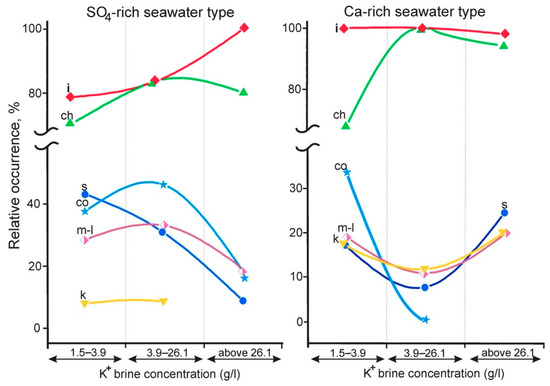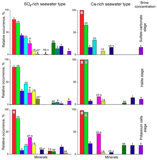 In particular, as the concentration increases, for the SO4-rich seawater type, the relative occurrence of illite rises, and decreases for smectite and mixed-layer minerals. In turn for the Ca-rich type, the relative occurrence of smectite and mixed-layer minerals first falls from the sulphate-carbonate to the halite stage, and then increases at the potassium salts stage. For seawater of both types, the relative occurrence of chlorite slightly decreases at the stage of potassium salts precipitation (Figure 3).