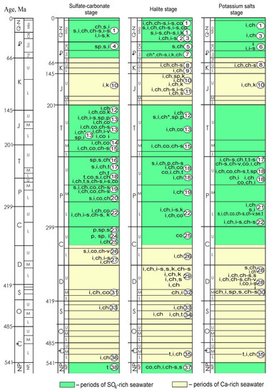 Magnesium-rich minerals in the Phanerozoic evaporites are rather unevenly distributed—they occur in 24 evaporite formations (out of 38). In the evaporites formed from SO4-rich seawater, several magnesium-rich minerals are described in each formation, namely Permian (7 formations), Triassic (4 formations), Pennsylvanian (3 formations), Upper Neoproterozoic (2 formations), as well as Neogene and Paleogene (one formation in each system). In the Jurassic, Mississippian, Silurian and Cambrian deposits, there is one formation in each system (and two formations in the Devonian), each containing one magnesium-rich mineral—all these formations were formed during the time intervals characterized by Ca-rich seawater (Table 4, Figure 6).