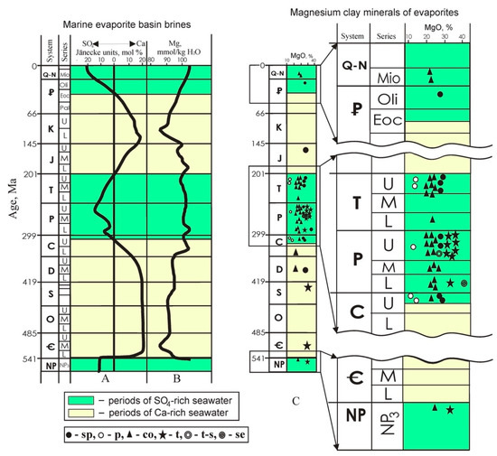 For magnesium-rich minerals (sepiolite, palygorskite, talc and corrensite), the path of direct precipitation from silica-, alumina-, and magnesium-rich solutions under certain physical and chemical conditions (pH, salinity, activity of silicon, aluminum, etc.) is the most acceptable process of formation and is confirmed by experimental work [5,109,110,111,112]. Silica and alumina entered the evaporite basin as a result of the destruction of unstable silicate or aluminosilicate minerals and volcanic ash, and the source of magnesium was concentrated SO4-rich seawater, which is characterized by elevated Mg content (Figure 6). Corrensite, in addition to precipitation from solutions, can be formed as an intermediate product of the conversion of smectite to chlorite [113]. The data considered by us show that there are sixteen cases in which corrensite occurs without chlorite-smectite, which may indicate its crystallization from aluminosilicate gel, and thirteen cases in which it is associated with chlorite-smectite, i.e. formed during the transformation of smectite into chlorite; thus, corrensite was formed in both of these ways. Pyroclastic material is required for the formation of magnesium-rich clay minerals: for corrensite—mainly of acidic rhyolite-trachyte, sometimes andesitic composition [114,115], for sepiolite and palygorskite—of alkaline basic composition [34,110]. This explains the fact that palygorskite is associated mainly with sepiolite, while corrensite (with one exception) does not occur with sepiolite. Thus, the formation of magnesium-rich minerals is usually associated with an elevated Mg content in seawater of SO4-rich chemical type and the input of pyroclastic material into the evaporite basin. Figure 6 shows that there are exceptions, as exemplified by the excursions of Mg in the Early Jurassic and Mississippian. The presence of magnesium clay minerals in some evaporite deposits was noted earlier [4,100], but at that time, there was no information about variations in the seawater chemistry during the Phanerozoic, and thus the global cause of uneven age distribution of these minerals could not be revealed.