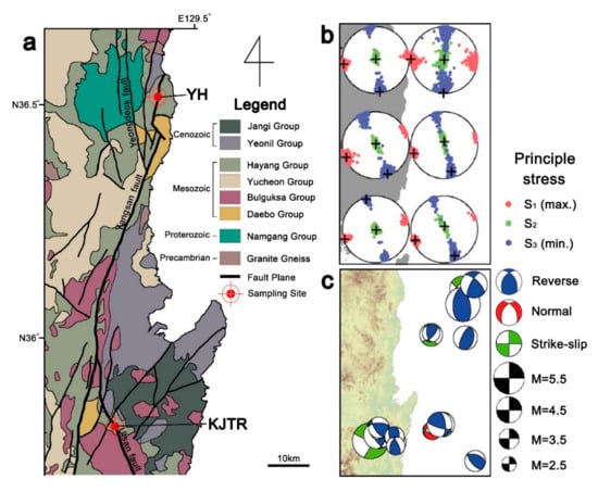 (a) Geological map of the southeastern part of Korea Peninsular (modified from the Korean Institute of Geoscience and Mineral Resources (KIGAM) geological map 1:1,000,000 [30]). Samples were obtained from the NNE-SSW striking Yangsan fault zone and NNW-SSE striking Ulsan fault zone; (b) Results of stress inversions using the misfit angle method (modified from Soh et al., 2018 [29]); (c) Map of the Southeastern Korean Peninsula showing the recent earthquake focal mechanisms (modified from Soh et al., 2018 [29]).