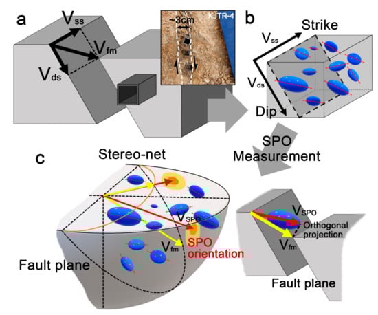 where SDIγ represents the maximum value of the angle between the γ% of grains surveyed and the densest point; φ has a value between 0° and 180°, and is the angle between the orientation that has the highest frequency (the densest point) and the major axis orientation of the target grain; Xφ is the number of objects in the major axis orientation placed under the spatial angle φ; and XT is the total number of objects; Therefore, the value of SDI, which determines the distribution density, ranges from 0° to 180°. In the stereogram results, which include the major axis SPO distribution, the fault motion orientation (Vfm), is estimated by orthogonal projection of the orientation with the highest SPO density (VSPO) (Figure 3c). This makes it possible to infer the fault motion direction more accurately as compared with the outcrop observation, which only determines the slip orientation by evaluating one 2D cross-section. After obtaining Vfm through the fault plane and VSPO, the fault type can be analyzed by separating Vfm into strike-slip (Vss) and dip-slip (Vds) components (Figure 3a,b).