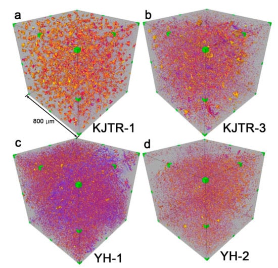CT images, obtained from the synchrotron, were processed through the reconstruction and image-filtering processes mentioned in Section 3.3. To minimize noise during filtering and to highlight grain boundaries, a nonlocal mean filter and an unsharp masking filter were used several times. The total applied filtering process was repeated approximately five to seven times for each image and the result of each filtering process was checked before proceeding to the next step. After the filtering process, a temperature-type filter was applied to visually confirm the grain. Representative CT images of samples corresponding to the fault gouge and cataclasite at the KJTR and YH sites, are presented in Figure 4. In the case of cataclasite (KJTR-3, Figure 4b and YH-2, Figure 4d), there were few large grains. In contrast, for the fault gouge (KJTR-1, Figure 4a and YH-1, Figure 4c), the grain size was generally large. In particular, in the KJTR-1 sample, many relatively large grains and few small grains were found. As it is difficult to directly observe the textures with only 3D-CT images, 2D cross-cut images are provided for each 3D image (Figure 5). In almost all samples (except YH-2), the foliation orientation of the matrix and weak SPO of grains were partially observed.