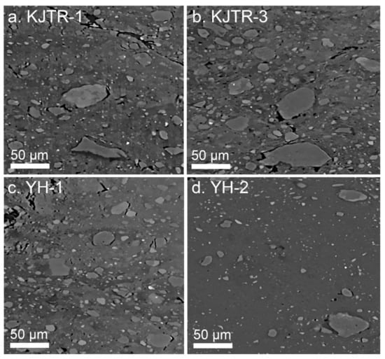 2D images of a cross-section taken from the CT images (Figure 4) of each sample. (a) KJTR-1; (b) KJTR-3; (c) YH-1; (d) YH-2.
