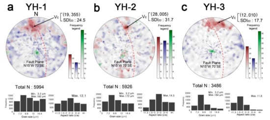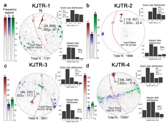 The orientation of the major, intermediate, and minor axes of quartz grains in all samples were measured and presented on a stereogram (Figure 6 and Figure 7). A total of 33,230 grains were investigated, and the minimum grain size was 3.2 μm, while the maximum size did not exceed approximately 200 μm for all target samples. The frequency of each type of grain classified by grain size and aspect ratio is normalized and shown in Table 2. The aspect ratios of the grains to be investigated ranged from 1 to approximately 15. Detailed statistical information of the investigated grains was released to the (Supplementary Materials Figures S1–S4). In KJTR-1, -2, -3, and -4 samples, the proportion of samples with aspect ratio values of 1.5–2 and 2–3 are high. The YH-2 sample had relatively few grains with a small aspect ratio, while the YH-3 sample had multiple grains with a small aspect ratio (<3). The densest point in the major axis orientation was shown by trend and plunge form, and the SDI20 value. In Figure 5, the major axis length is taken as a proxy for grain size, and the grain size distribution and aspect ratio (a/c) are given as histograms. In samples KJTR-1, -2 and -4, the fault plane dipped steeply towards the west (WSW) and the major axis plunged shallowly towards the north. In sample KJTR-3, the fault plane dipped steeply towards the east (ESE) and the major axis plunged towards the southwest. Moreover, the major axes scatter was relatively low for all samples. The intermediate and minor axes plunged in various directions for each sample. For KJTR-1, the intermediate and minor axes scatter was very high, while in sample KJTR-2, the scatter of all axes was very low. In the KJTR-3 and -4 samples, two axes were distributed on a vertical plane of the densest point of the major axis. At the YH site, the fault plane dipped steeply towards the west (WNW). In all three samples, the major axis plunged shallowly towards the north (Figure 7). In addition, the relatively scattered intermediate axis direction orientation and concentrated minor axis direction orientation were revealed in the stereogram.