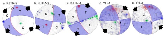 Stereograms showing the SPO result of KJTR-2 (a), -3 (b), and -4 (c), and YH-1 (d) and -3 (e) samples analyzed by their focal mechanism (lower-hemisphere, equal-area projection). The direction in which the tensile strain works is colored blue. All samples except the YH-1 sample shows a sinistral type strike slip fault. T, tensile strain and C, compressive strain.
