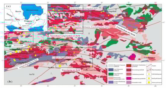 The Beishan region, China, is located in the north-eastern part of the Tarim Basin, in the west-central part of the Palaeozoic Tianshan–Yinshan–Great Hinggan metallogenic belt, adjacent to the Middle Tianshan Massif. It is a typical intersection of multiple geological unit structures (Figure 1a) in the previous research work [,,,]. Proterozoic, Palaeozoic, and Mesozoic strata are the ore-controlling stratum. The Beishan region comprised a Precambrian crystalline basement and overlying sedimentary rocks of Palaeozoic–Mesozoic age. These intrusions formed from the Precambrian to the Permian and are separated by well-developed fault-related hosts and grabens []. The late Palaeozoic tectonic history in the region is closely related to the subduction and subsequent trapping of the southern Tianshan oceanic plate under the Junggar and Tarim plates during the Middle Ordovician through the Silurian []. The Beishan region can be divided into three tectonic units, bound by the Liuyuan–Daqishan and Hongshishan–Heiyingshan faults, which were affected by multiple stages of magma intrusion during the Carboniferous and Permian. Furthermore, the structure of this study area is involved, along with large-scale strong tectonic, magmatic, and metamorphic effects, which provide heat and channels for the activation, transfer, and enrichment of metal elements, and form abundant gold (Au) resources []. The Beishan region, one of the most significant potential Chinese gold production zones, has had more than 200 tons of gold discovered as of yet [,]. There is still excellent gold potential undiscovered in this study area, due to the cover of surface vegetation and complexity of the convergent zone in this region [].