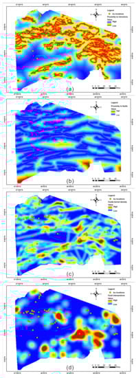 Predictor maps of geologic influencing factors. (a) Distance to intrusions; (b) proximity to faults; (c) fault kernel density; and (d) faults intersections.