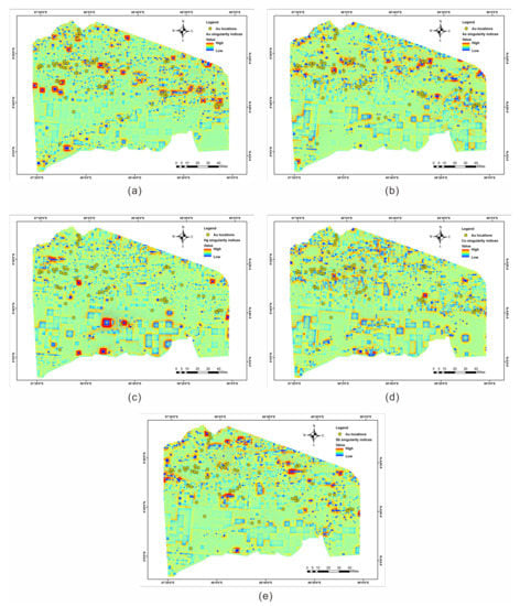 Maps of geochemical element singularity indices. (a) Au; (b) As; (c) Hg, (d) Cu; and (e) Sb.