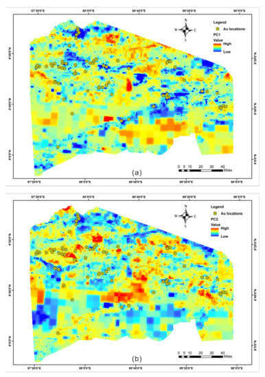 PCA was employed to extract multi-element geochemical associations that may reflect the signature of the ore-forming processes (Figure 4). From a big data perspective, compared with variables extracted based on mineral systems, principal components (PCs) of these geochemical elements may reveal a correlation with the mineralisation process to a certain extent. Additionally, due to the influence of data closure (i.e., all components sum to a constant), a centred log-ratio transformation method was used to open the closed geochemical data [].