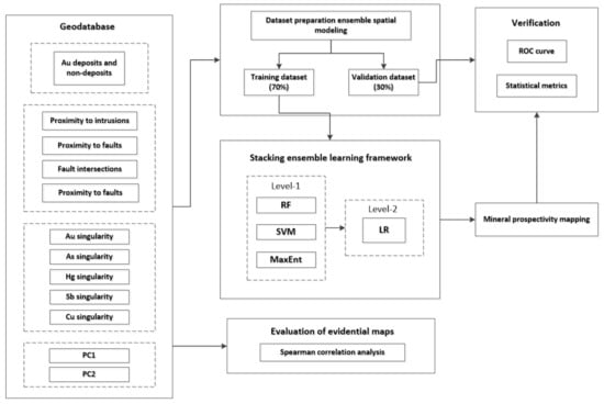 Preparation of the input datasets (including features and targets) is the first step of MPM. The integration of multi-source datasets was implemented by using ESRI’s ArcGIS 10.5 software. The SELM framework, including model training and evaluation, was implemented under the framework of the scikit-learn package and in Python 3.6 of Pycharm, which provides rich resources of machine learning algorithm packages. Furthermore, every evidence raster layer was created with a cell size of 500 m. This grid cell size was determined depending on the spatial distribution pattern of known gold deposits and related faults and intrusions that ensure only one deposit exists in any given grid unit [].